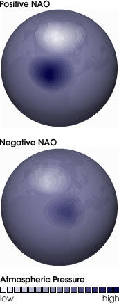 The North Atlantic Oscillation, or NAO, is a pattern of increased and decreased atmospheric sea level pressure over the North Atlantic Ocean. There are two phases of the NAO: either positive or negative. A positive NAO results in a strong high pressure system in the mid-latitudes of the Atlantic Ocean, often referred to as the Azores High, as well as a strong low pressure system in the upper mid-latitudes of the Atlantic Ocean, often referred to as the Icelandic Low. A negative NAO results in both a weaker Azores High and a weaker Icelandic Low. In other words, a negative NAO represents a weaker pressure gradient across the North Atlantic Ocean.