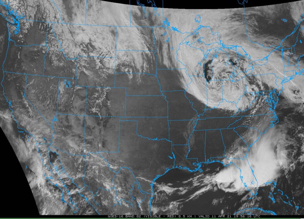 On the left is the 500mb analysis with cold air advection (CAA) circled in blue and warm air advection (WAA) circled in red. On the right is a visible satellite imagery from the same day as the 500mb analysis. Image on the right courtesy of College of DuPage.