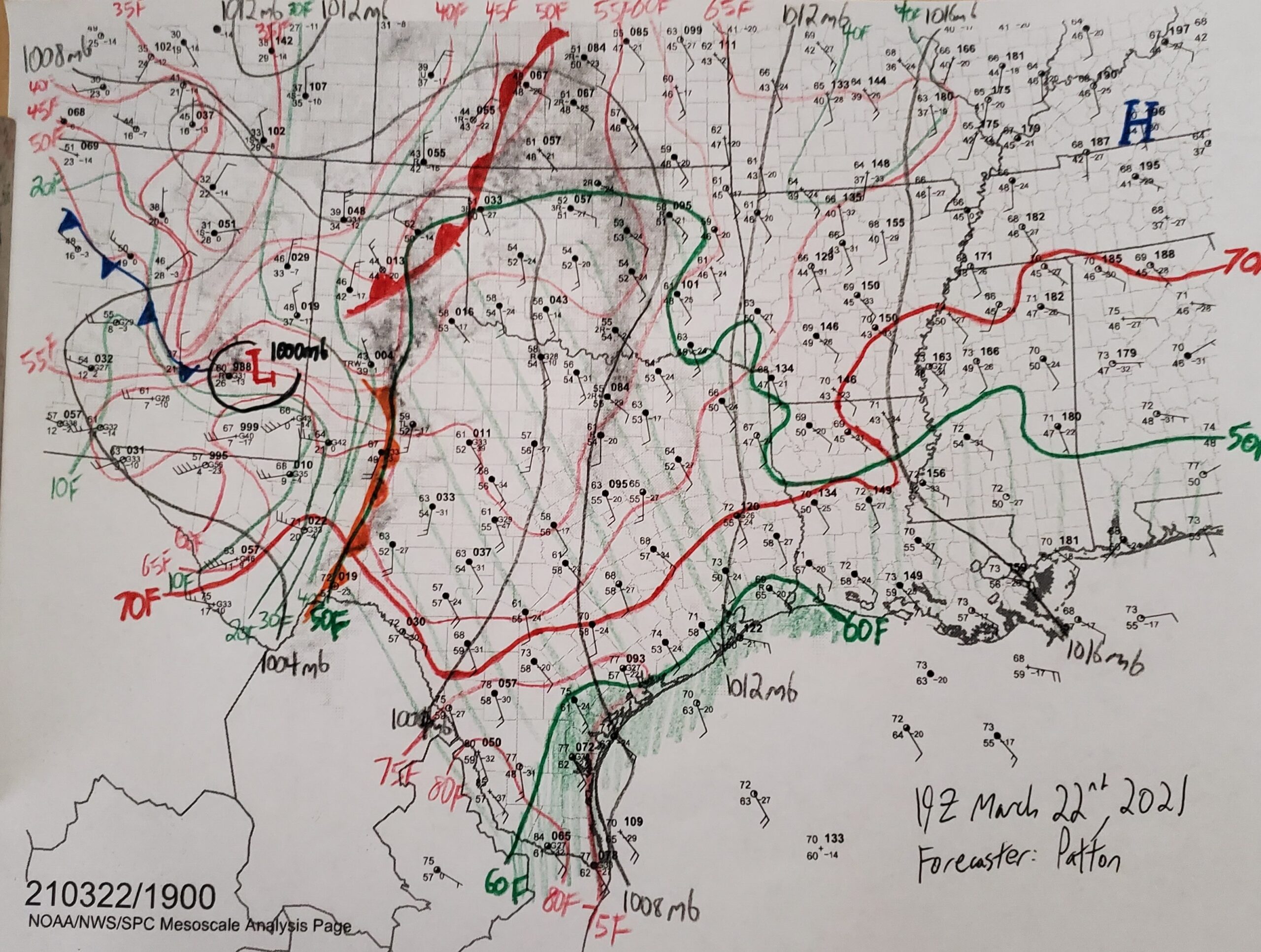 Each station plot includes the MSLP value in the top right corner with a 3 digit bold number. If that 3 digit bold number is less than 500, then put a “10” in front of the number and divide by 10. In the example above, the three digit bold number representing the MSLP measurement is 133. Because this number is less than 500, put a “10” in front of the number and then divide by 10 to get the MSLP value in millibars. This results in the actual MSLP value of 1013.3 millibars. If that three digit bold number is greater than 500, then put a 9 in front of the number and divide by 10. For example, in the larger surface map above, the three digit bold number at the station next to the surface low drawn with the large red L is 988. This represents an MLSP of 998.8 millibars.