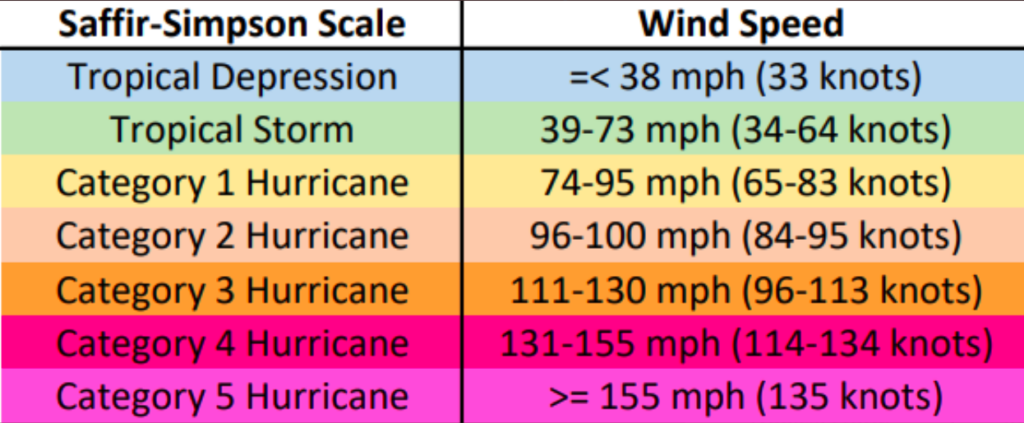 Tropical cyclones in the Atlantic basin are classified by their wind speeds according to the Saffir-Simpson scale. Hurricanes are categorized by their strongest winds from Category 1 to Category 5, with 5 being the strongest category. Tropical cyclones can form with wind speeds below hurricane strength: they are either classified as a tropical depression or a tropical storm, depending on how strong the wind speeds are. A storm system will be officially classified as a tropical cyclone by the National Hurricane Center in the Atlantic basin when it exhibits a complete circulation around the center of the storm and shows certain tropical characteristics.