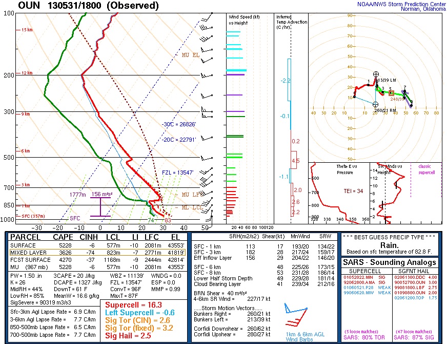 Soundings are plots of the data retrieved from weather balloons and they can be pivotal in understanding the characteristics of the atmosphere for forecasting. They are one of the few ways in which the atmosphere is directly measured by instruments at higher altitudes. Below is an example sounding from Norman, Oklahoma just before an infamous severe weather outbreak. This lesson will explore how to interpret some of the features of soundings such as this one.