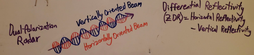 Between 2000 and 2010, the National Weather Service upgraded almost all of their radars to have dual-polarization capabilities. Dual-polarization means that the radar is actually sending out two radar beams at any time, one which is oriented horizontally, and one which is oriented vertically. This allows meteorologists to tell the shape of objects being intercepted by the radar beam. This is important for identifying what type of hydrometeor (such as rain, hail, sleet, snow) is occurring along the radar beam. For example, when raindrops fall, they take the shape of discs, which are larger in the horizontal direction than the vertical direction. This means that if the radar is detecting raindrops, it would be expected to return more power in the horizontal direction than in the vertical direction. However, if a thunderstorm becomes strong enough to produce hailstones, even if the hailstones are very spiky, the hailstones will be tumbling up and down in the updrafts and downdrafts of a thunderstorm, and will appear to the radar to be circular (i.e. returning equal power in the horizontal and vertical directions).